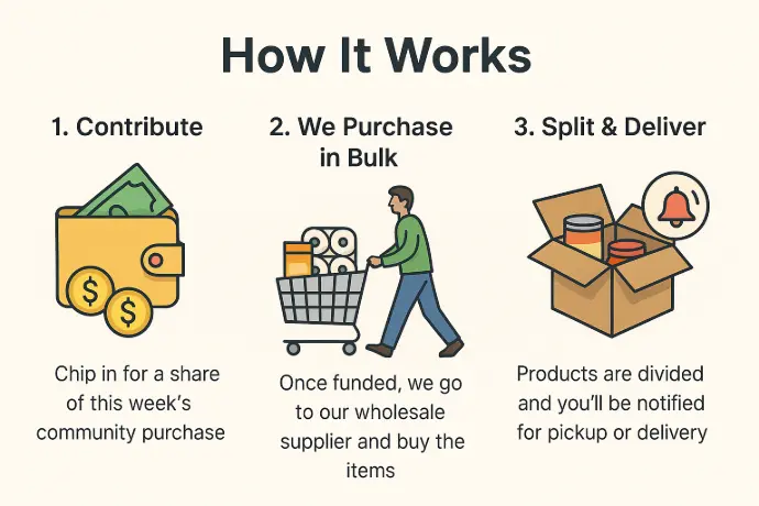 It’s like crowdfunding for groceries, household goods, and essentials — but it’s real, local, and directly benefits the people who join.